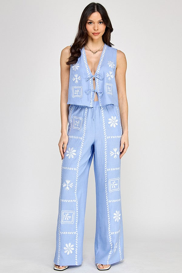 Set bordado en tela ligera color azul