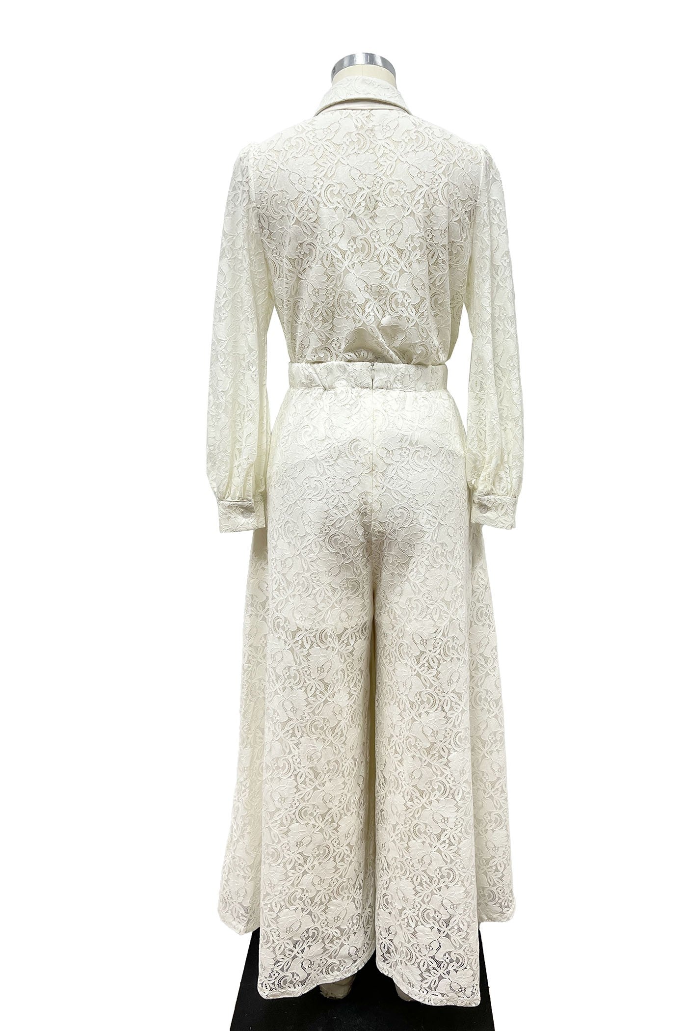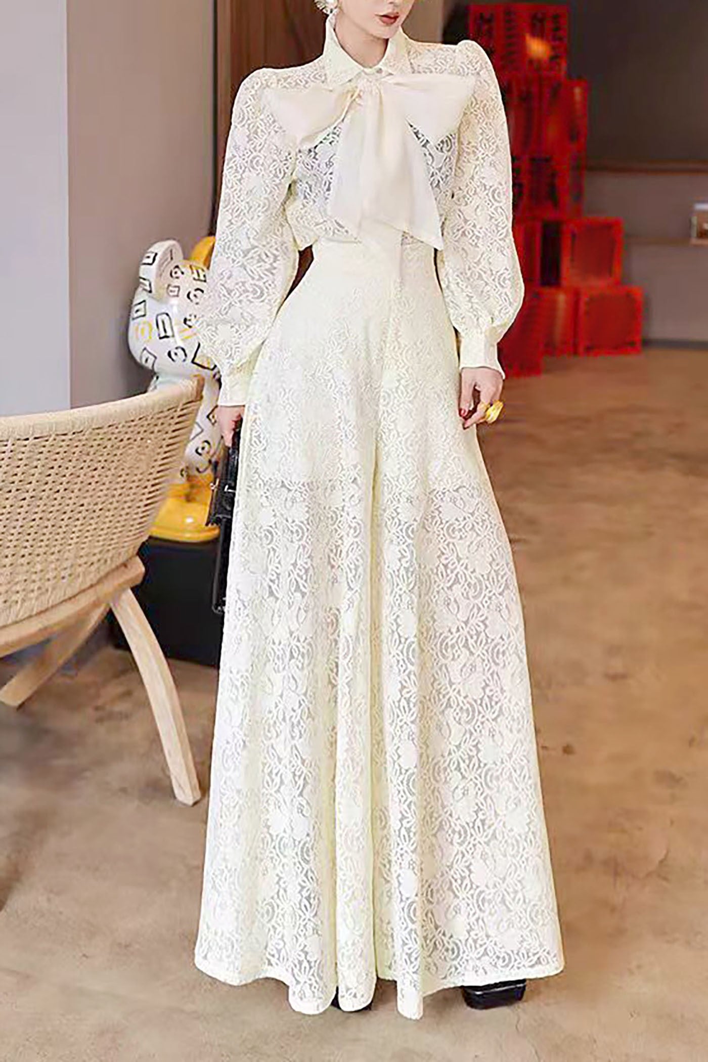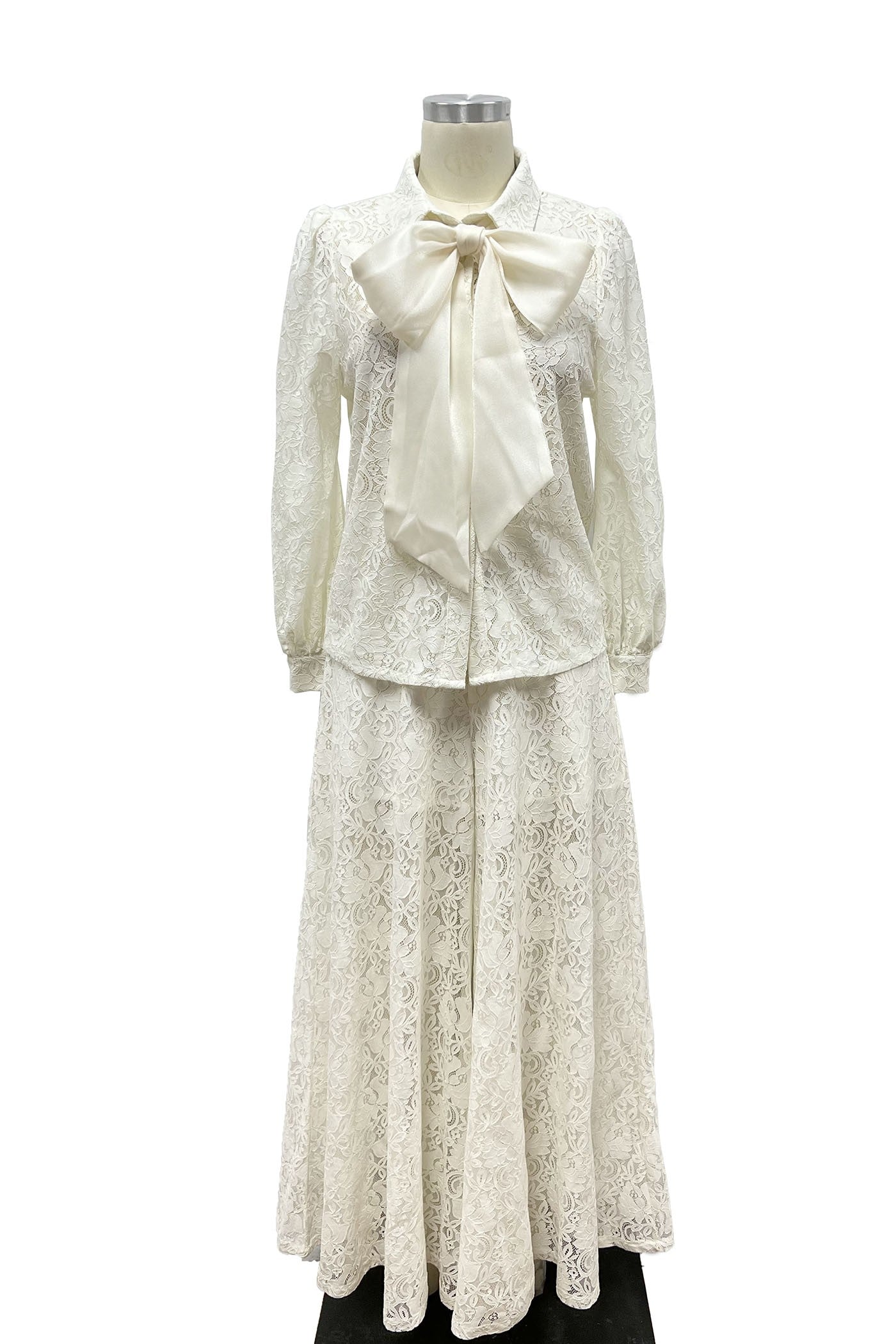 Set en color blanco, en tela de encaje con moño en el top y pantalón ancho