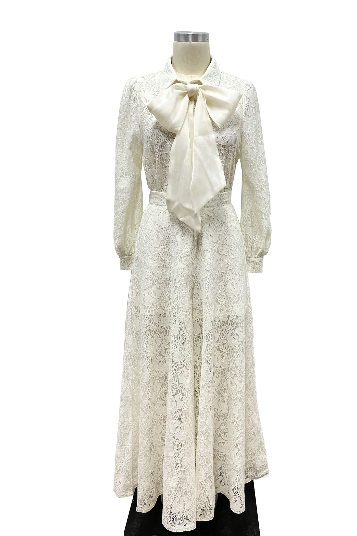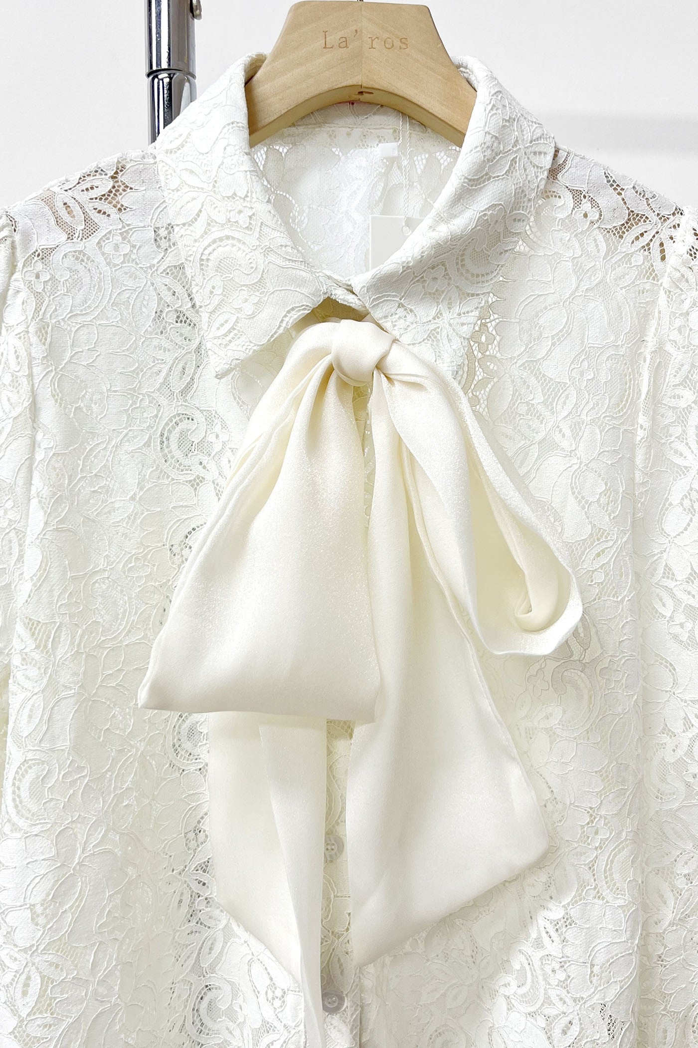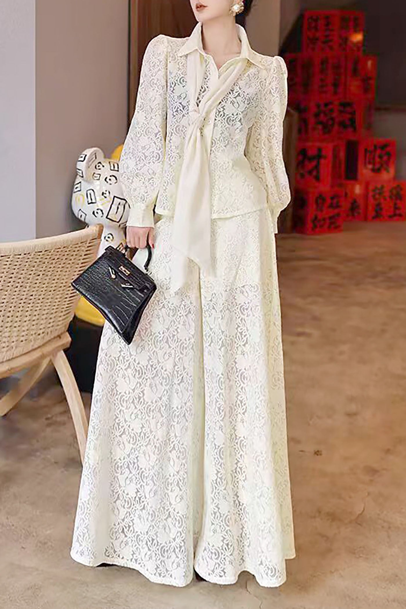 Set en color blanco, en tela de encaje con moño en el top y pantalón ancho