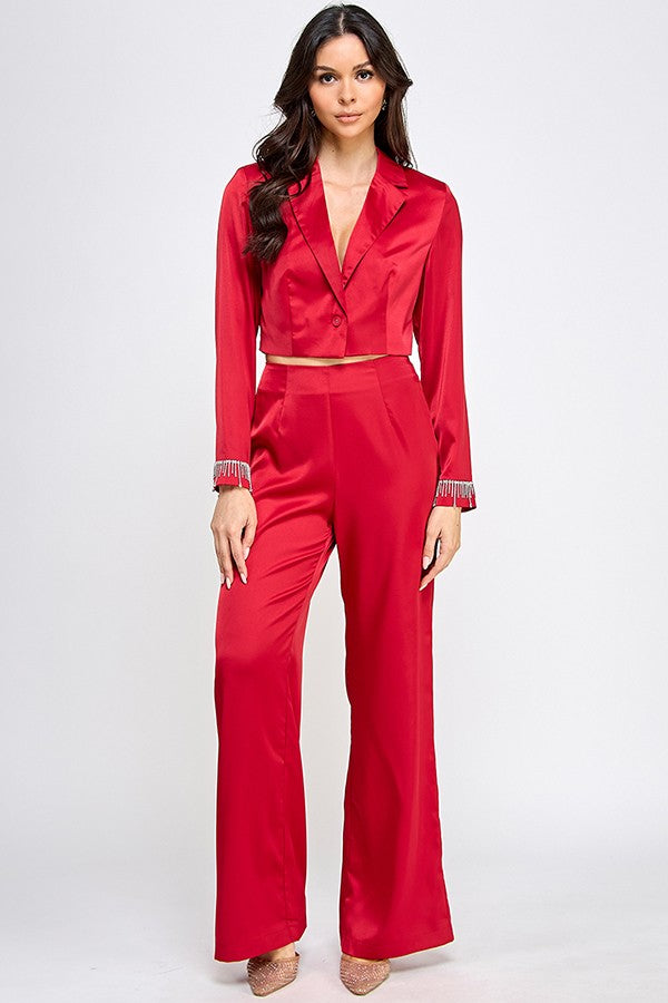 Set de top u pantalón en tela de satín , con detalle en las mangas