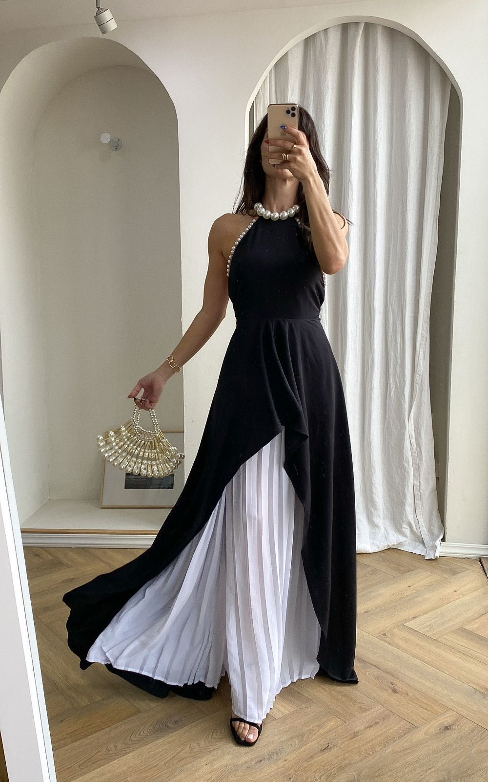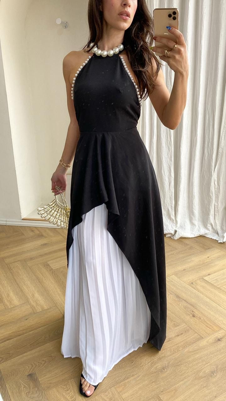Palazzo Corte halter , con perlas en el cuello, pantalón blanco plisado