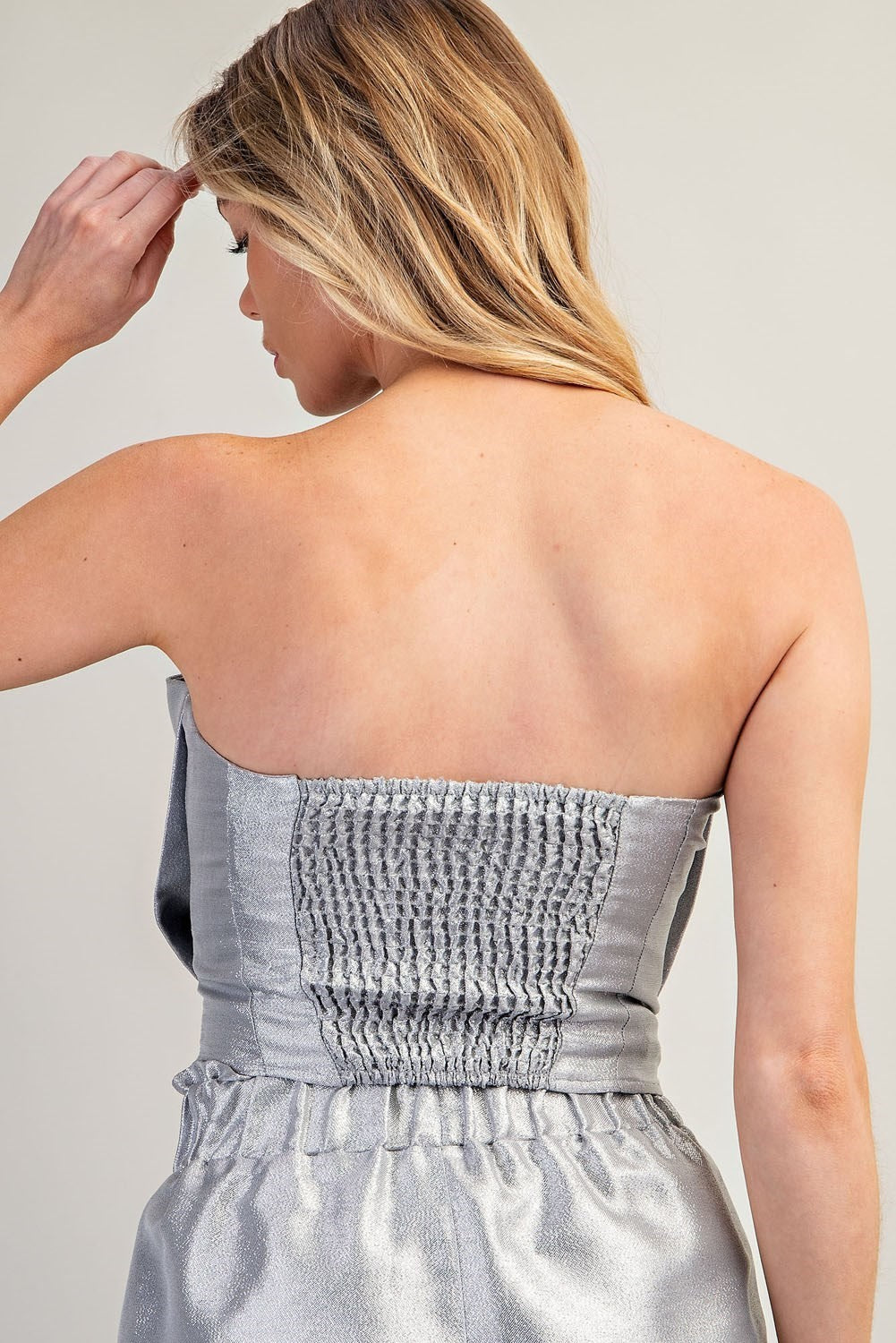 Top tipo strapples con moño al frente y espalda elástica color dorado claro metálico