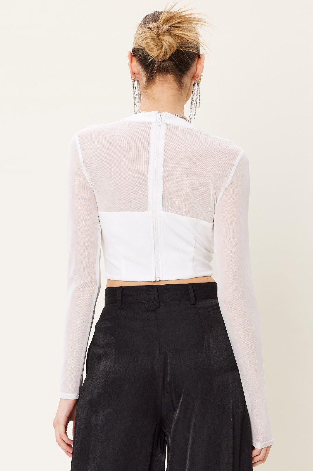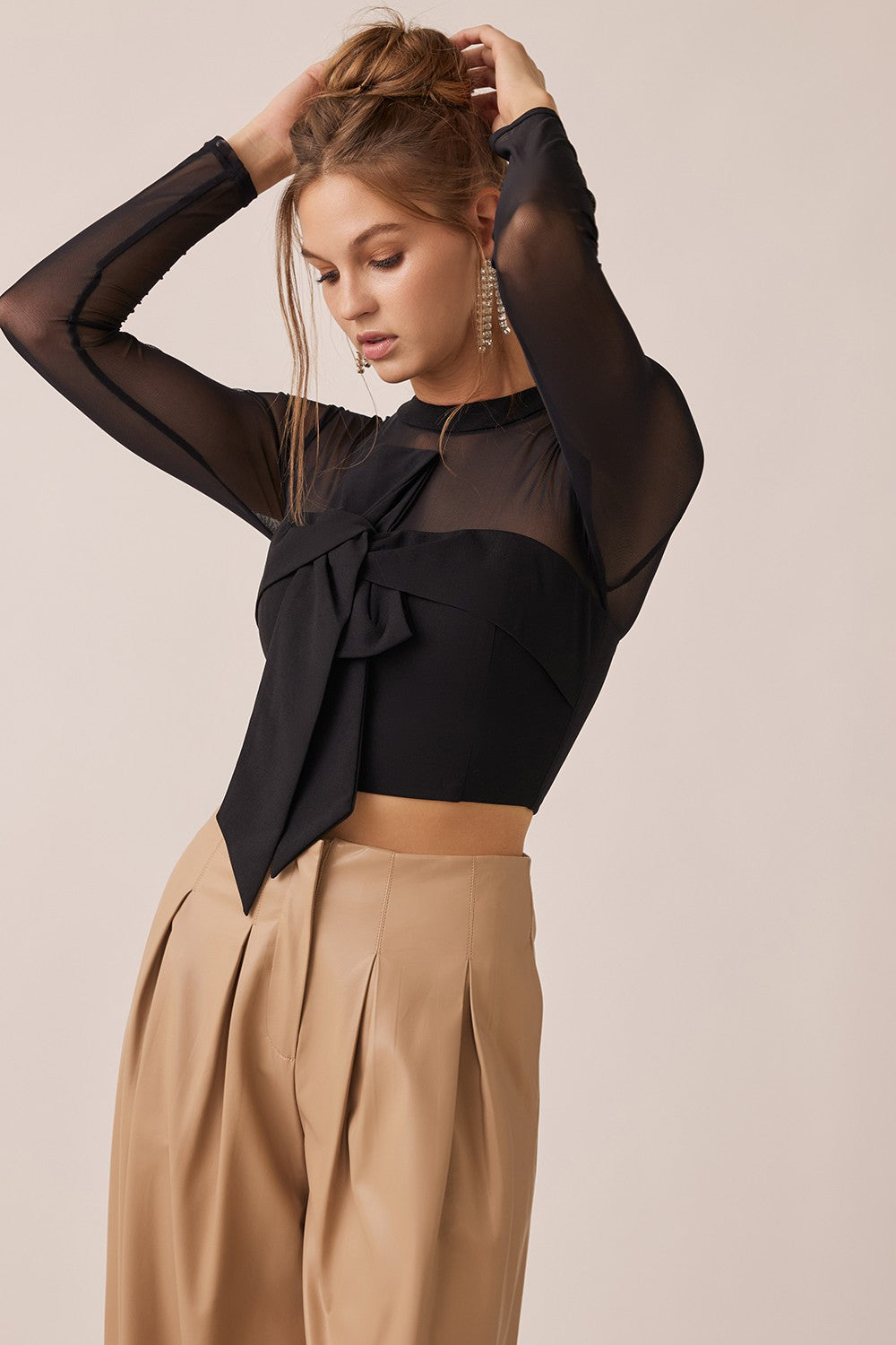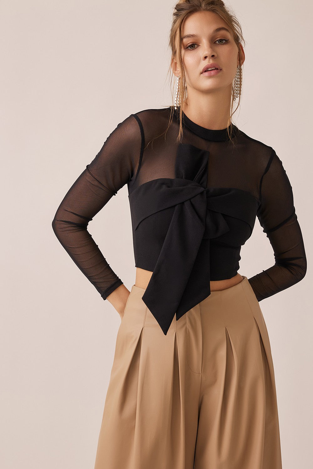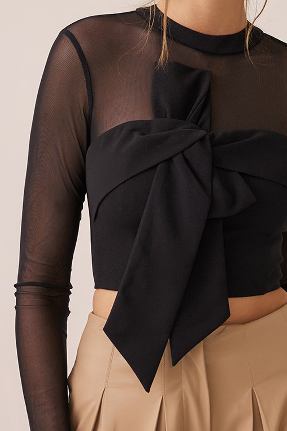 Blusa manga larga en tela malla semitransparente, cuello redondo, con detalle en nudo frontal, con cierre al reverso