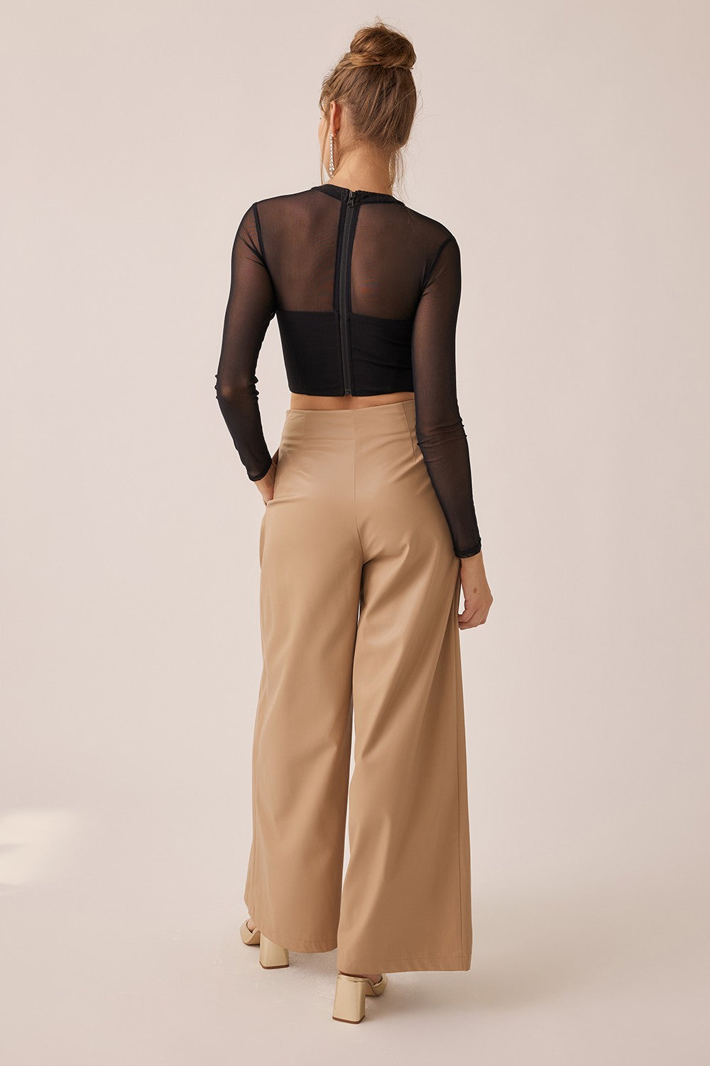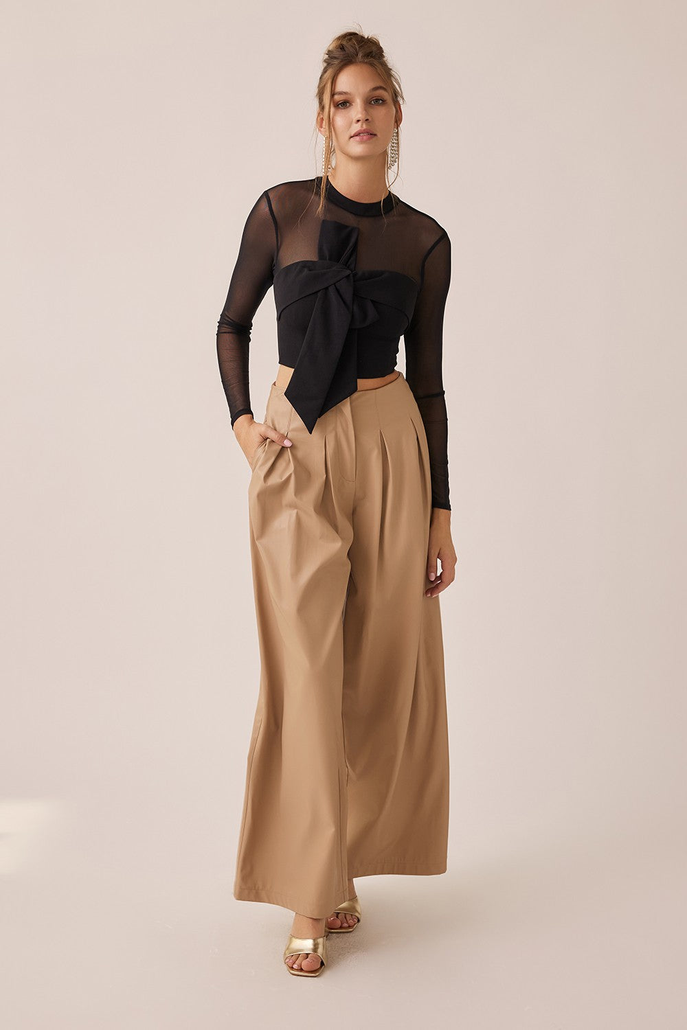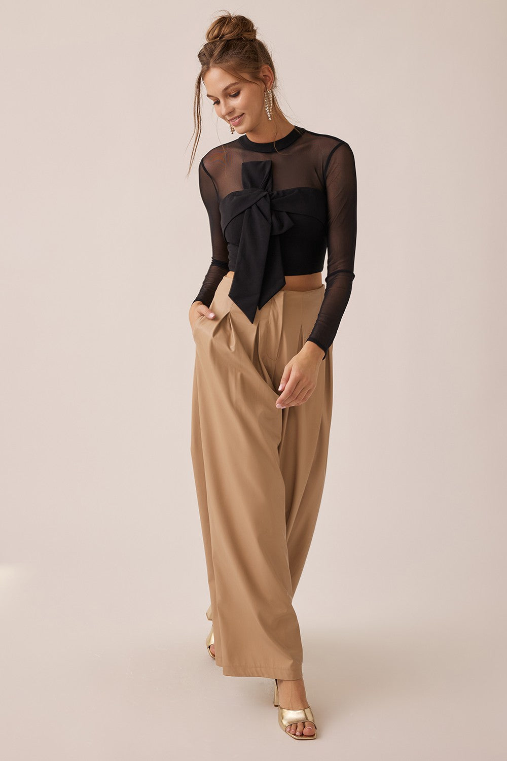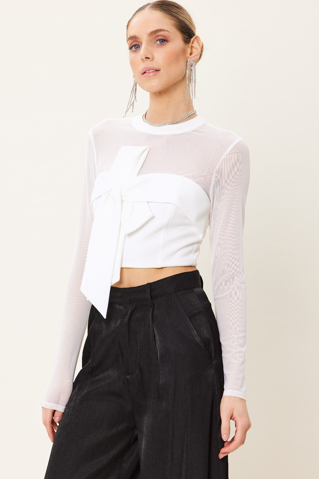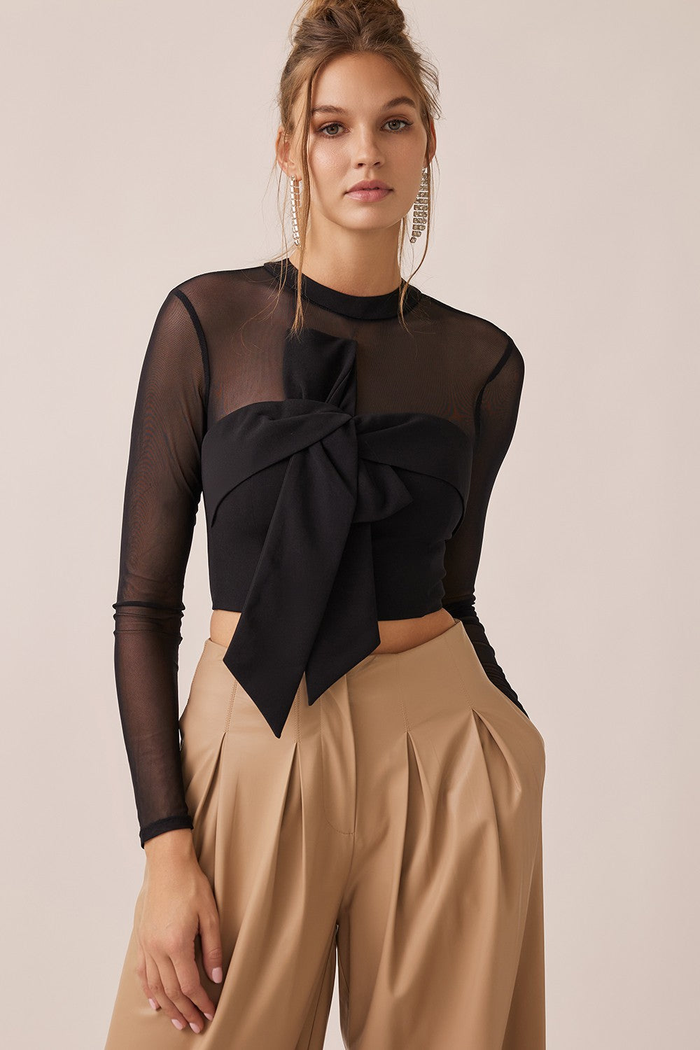 Blusa manga larga en tela malla semitransparente, cuello redondo, con detalle en nudo frontal, con cierre al reverso