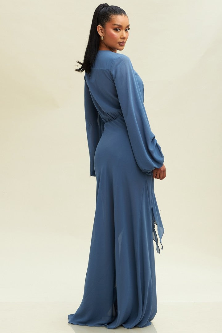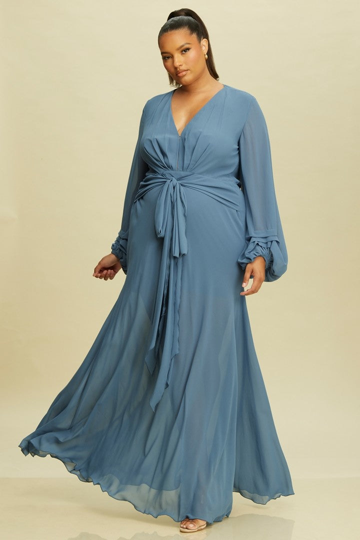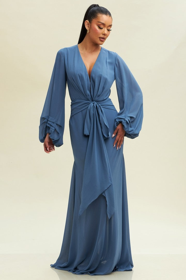 Vestido manga larga con nudo al frente, escote en V en tela ligera