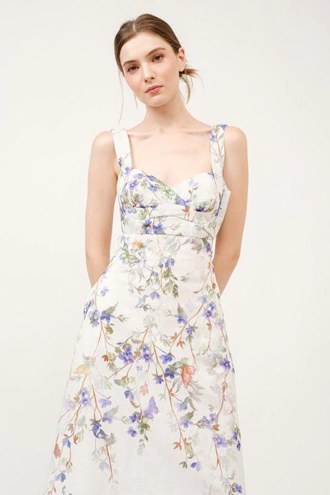 Vestido midi blanco con moño en la espalda y estampado de mariposas